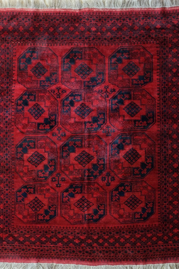 Afgańskie dywany są niezwykle charakterystyczne. Głęboka czerwona barwa, głównie koszenilowa, choć czasem także ciepła czerwień marzanny, ograniczona kolorystyka, bardzo stare, zgeometryzowane, rustykalne wzornictwo – ciągi powtarzalnych guli (medalionów), lśniąca zdrowa wełna, doskonale wiązane wyroby.