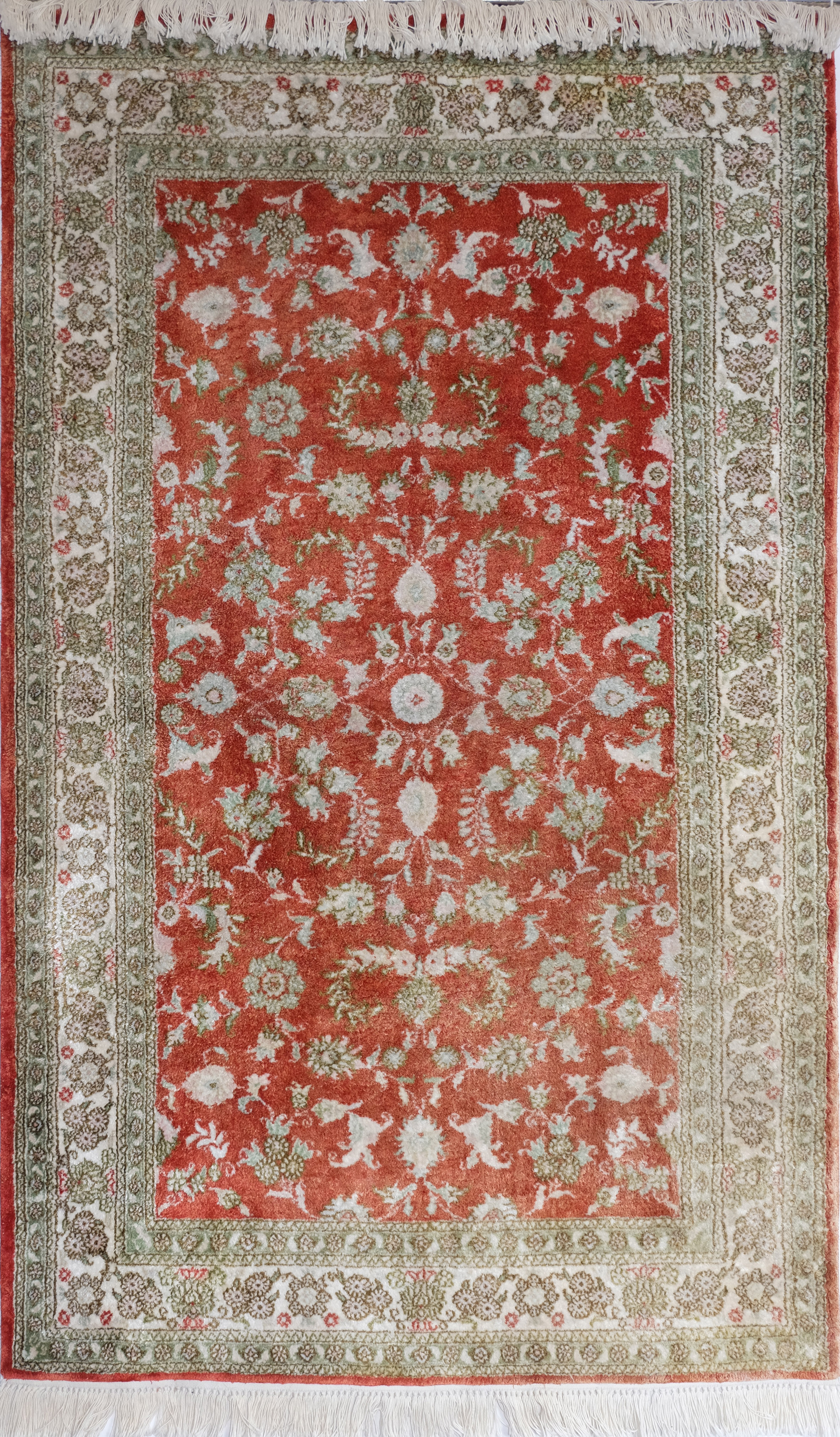 Opisywany kobierzec wykonano z jedwabiu, a delikatne tworzywo w połączeniu z pastelową kolorystyką i subtelnym wzorem dało wyrafinowany wyrób.
