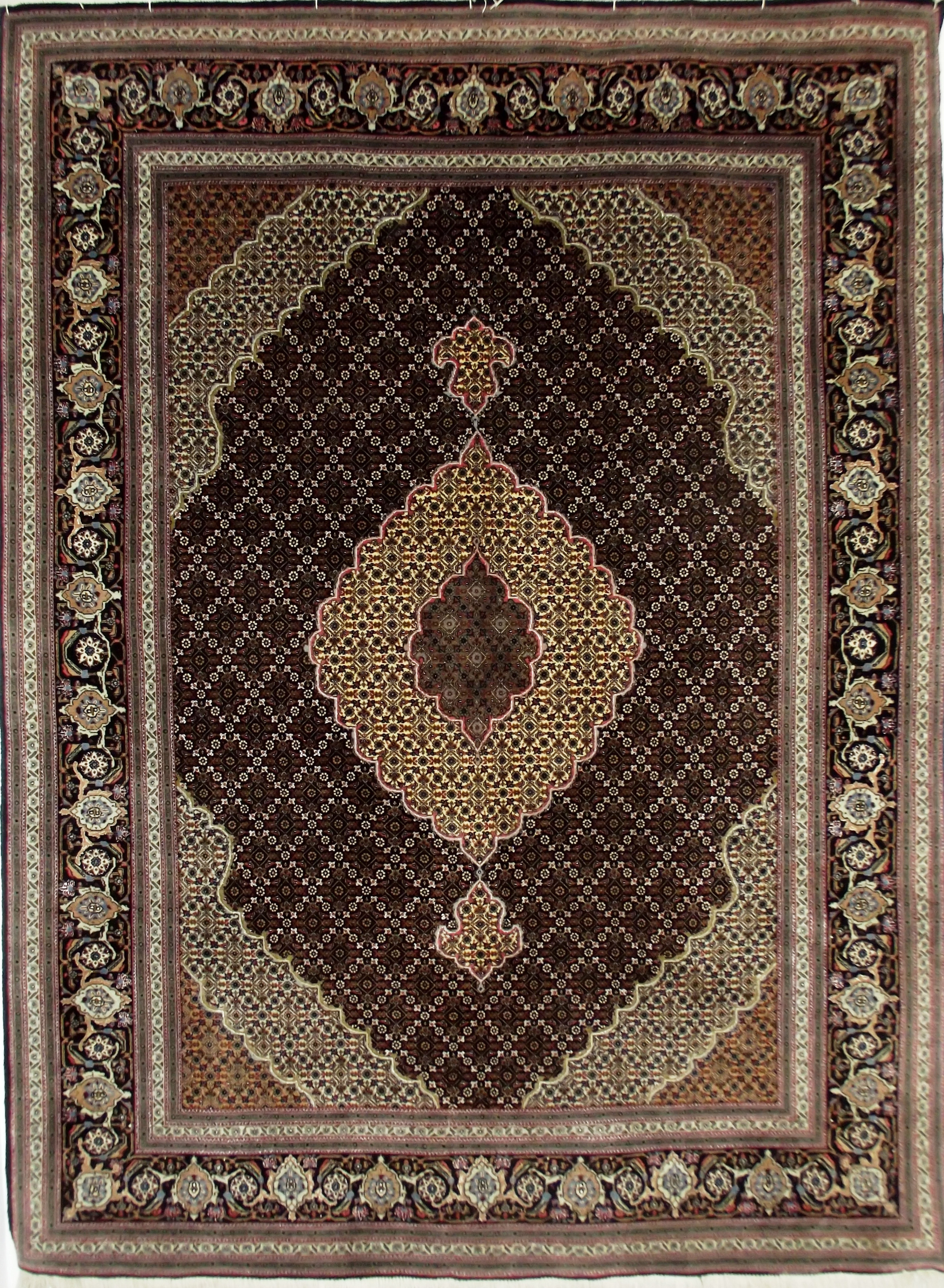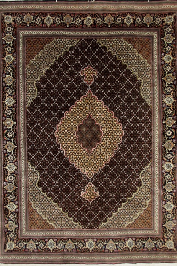 Tebriz mahi (mahi = wzór rybi = wzór Heratu), jeden z najoryginalniejszych wzorów kobierców automatycznie kojarzony z miejscem powstania. Ten charakterystyczny obraz, o pięknie zarysowanym polu wypełnionym różnymi wariantami wzorów Heratu, z medalionem zdobionym wisiorami, będącymi graficznym przedstawieniem lilii, z samowarową lub krabową, jeśli ktoś woli, bordiurą, kobierzec o wyrafinowanej tonacji, jest sumą wszystkiego, co można powiedzieć o tkactwie tebriskim. Wpływy Bidżaru i Kaukazu, precyzja Isfahanu, elegancja Kaszanu. Perska perła w najdoskonalszym wydaniu – precyzja tkania właściwa najlepszym dywanom jedwabnym, połączenie jedwabiu i wełny, wspaniale skomponowana kolorystyka. Bardzo cenny kobierzec.