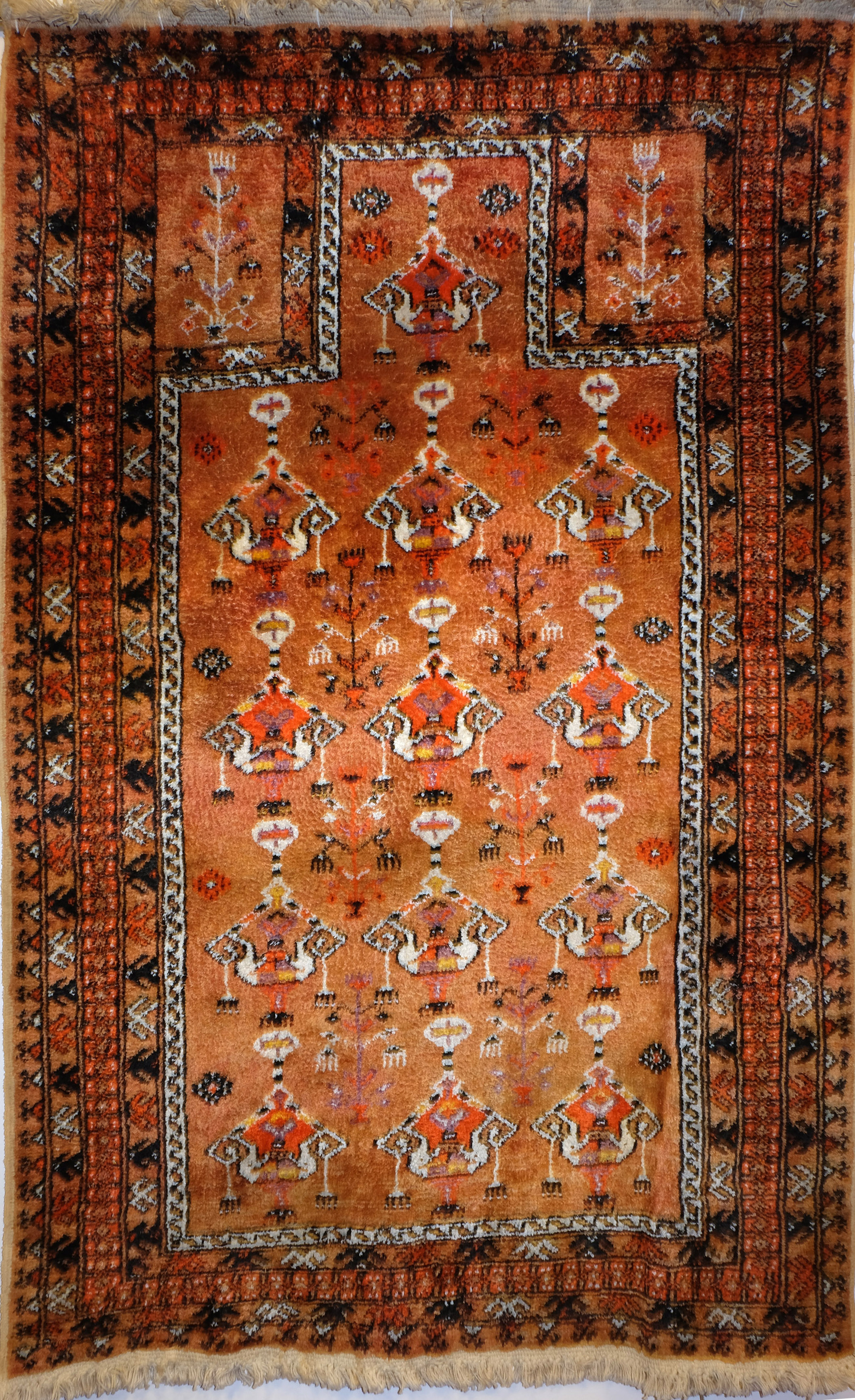 Opisany kobierzec należy do wyjątków. Szafranowe barwy czy jedwabna nić pojawiają się w jomutach niezwykle rzadko. Podobnie jak modlitewne dywany. To rarytas.